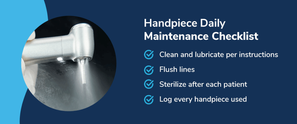 - Daily maintenance checklist: Clean and lubricate per instructions, flush lines, sterilize after each patient and log every handpiece used.