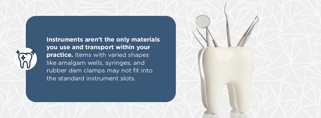 Instruments aren’t the only materials you use and transport within your practice. Items with varied shapes like amalgam wells, syringes, and rubber dam clamps may not fit into the standard instrument slots. Many dental cassettes come with accessory compartments for this reason.