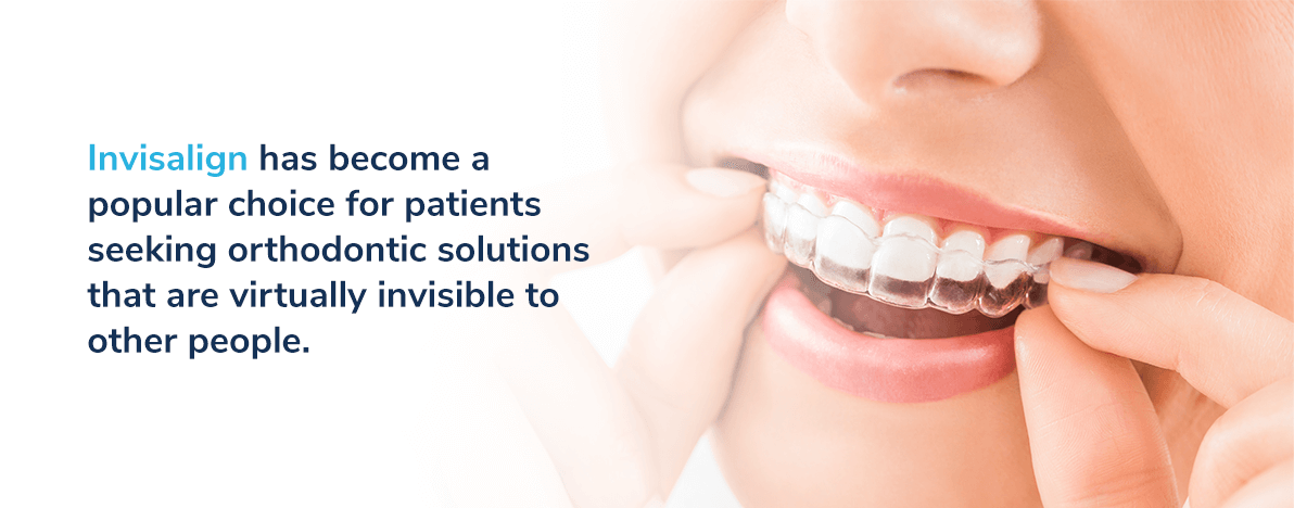 Invisalign has become a popular choice for patients seeking orthodontic solutions that are virtually invisible to other people. The treatment is also convenient, as people can remove their clear plastic trays from their mouths before eating or drinking and put them back in afterward. The Invisalign process is substantially shorter than the usual treatment period for traditional braces, ranging from six to 18 months. The cost is also appealing, as they are not much more expensive than conventional metal braces, and health insurance companies are increasingly covering these prices.