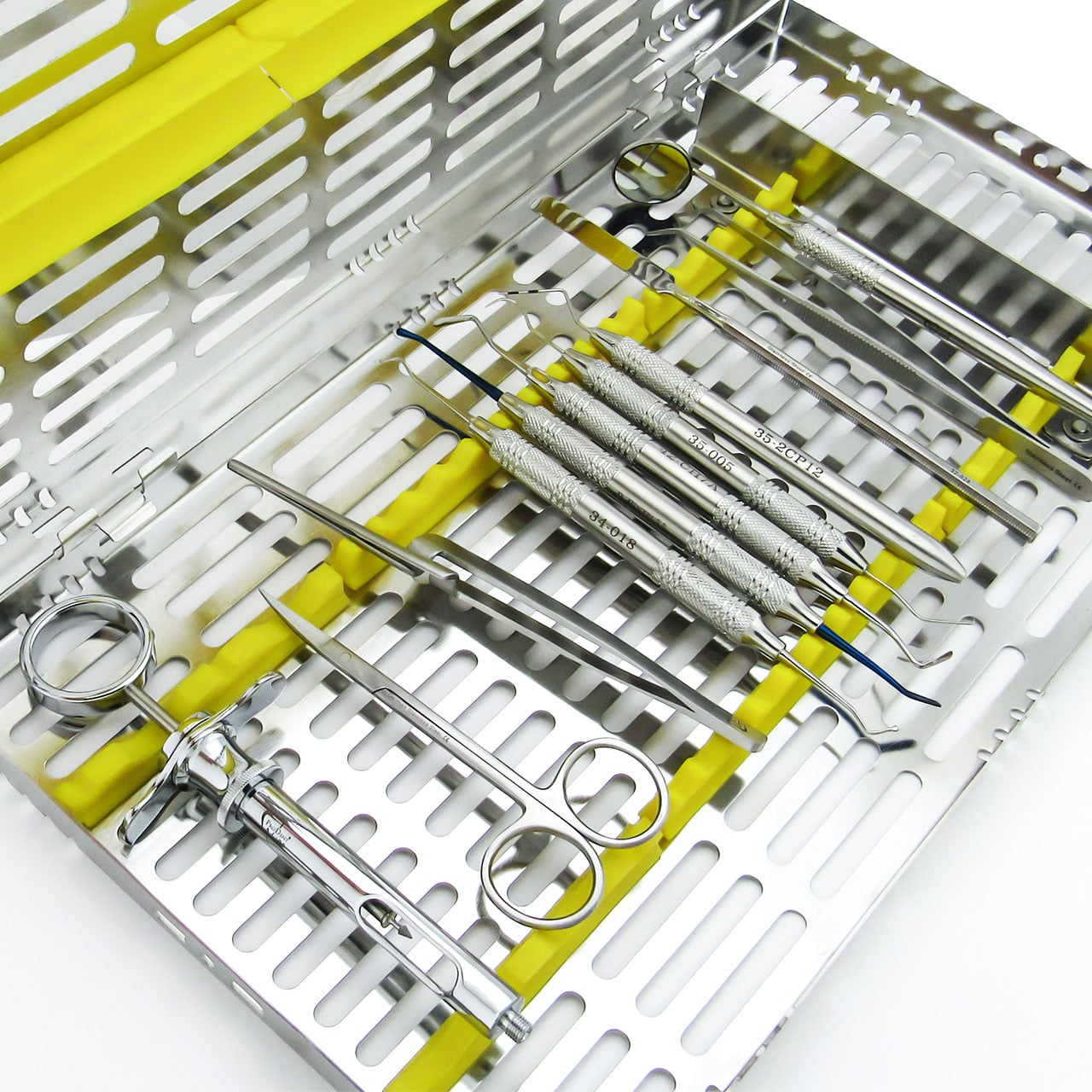 Includes large sterilizing cassette, #5 mouth mirror & handle, explorer #5, probe CP12, 18 excavator, 113 serrated cord packer, 2 Goldstein Composite Instrument, cement spatula 24, college pliers, articulating paper forceps, type CW aspirating syringe, iris scissors curved
