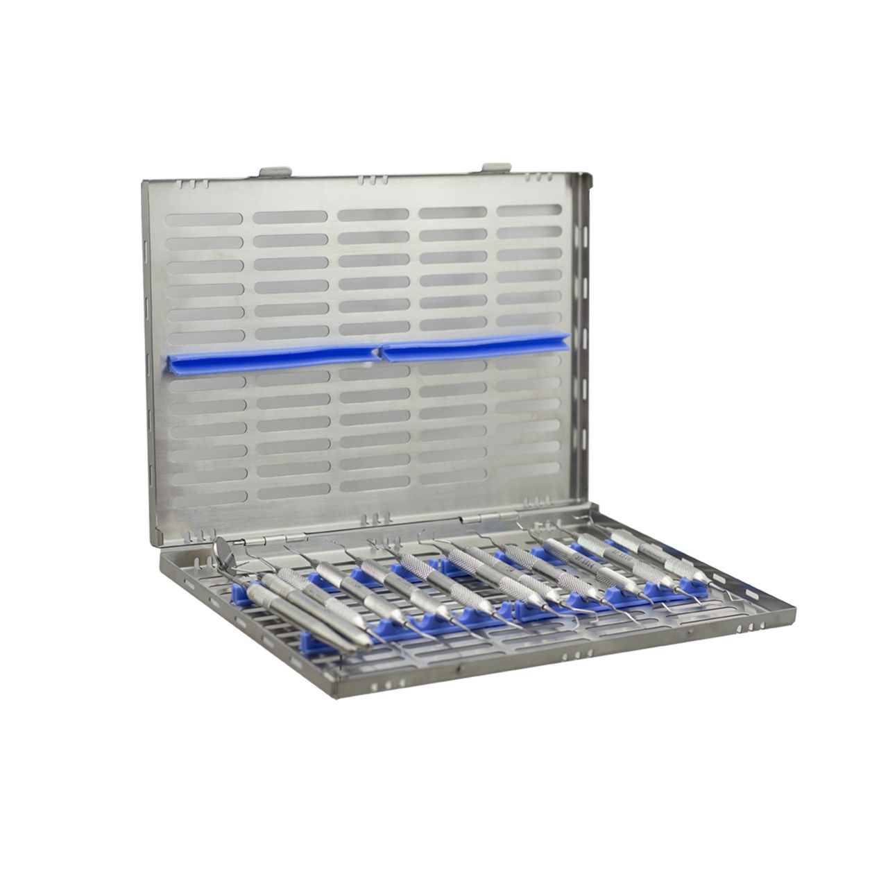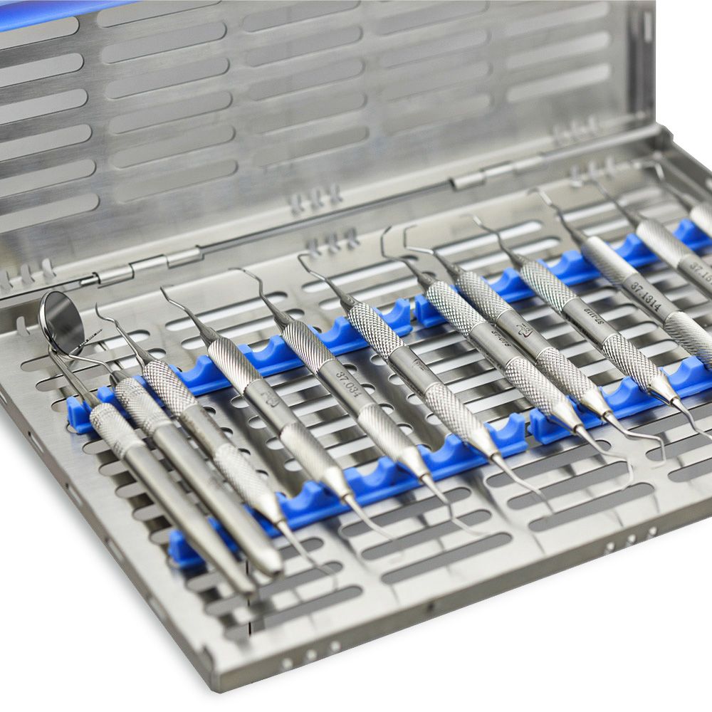 Periodontist recommended set comes equipped with everything you need to help treat the removal of deep subgingival calculus, deep scaling, and root planning. Kit includes Medium Flat Cassette 94-170, 204S Posterior Sickle Scaler 39-204S-R, UNC15 Probe 35-2UNC15, #5 Cone Socket mouth mirror with hollow handle 29-100, and all 9 Gracey Curettes in regular steel.